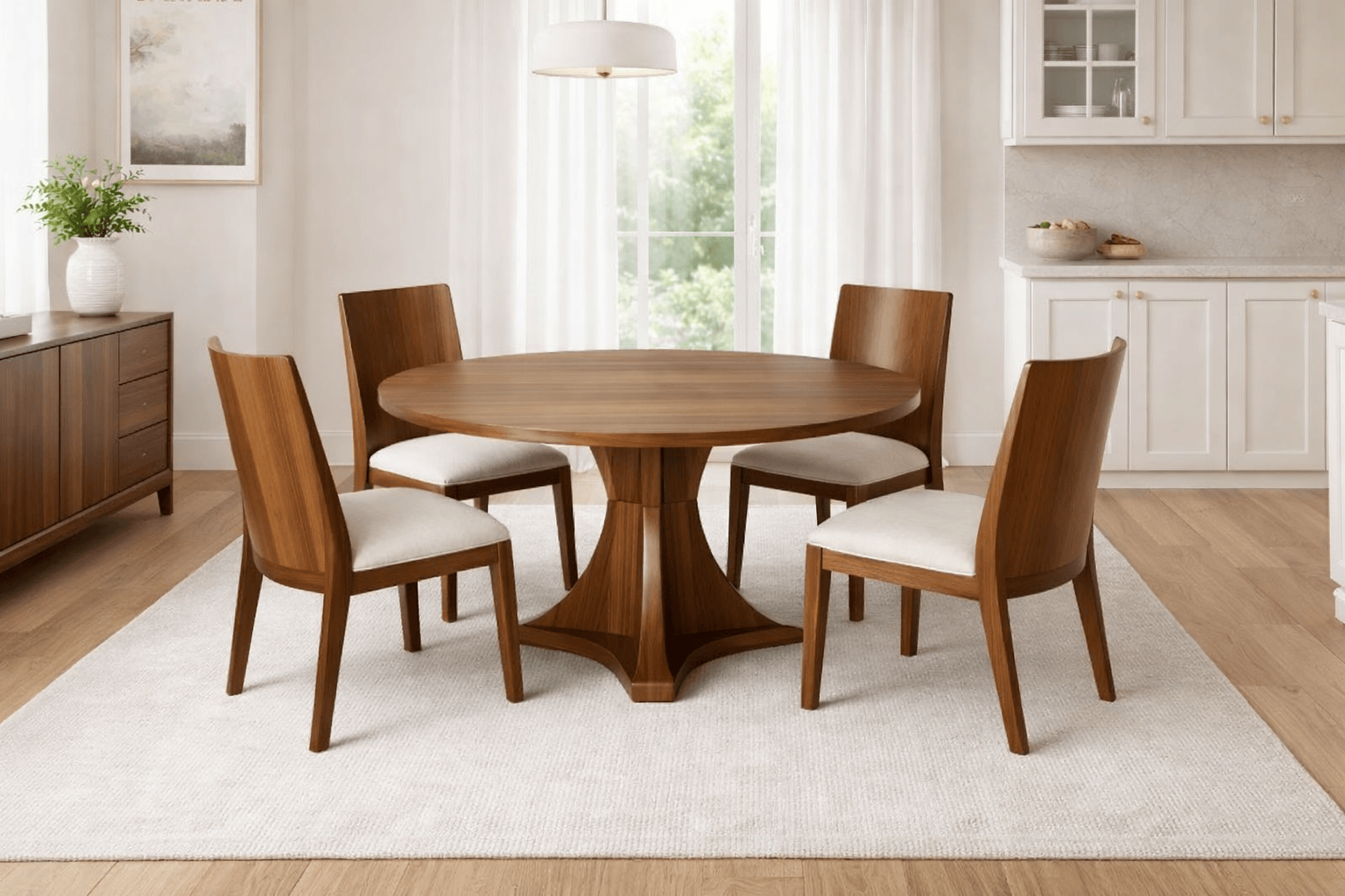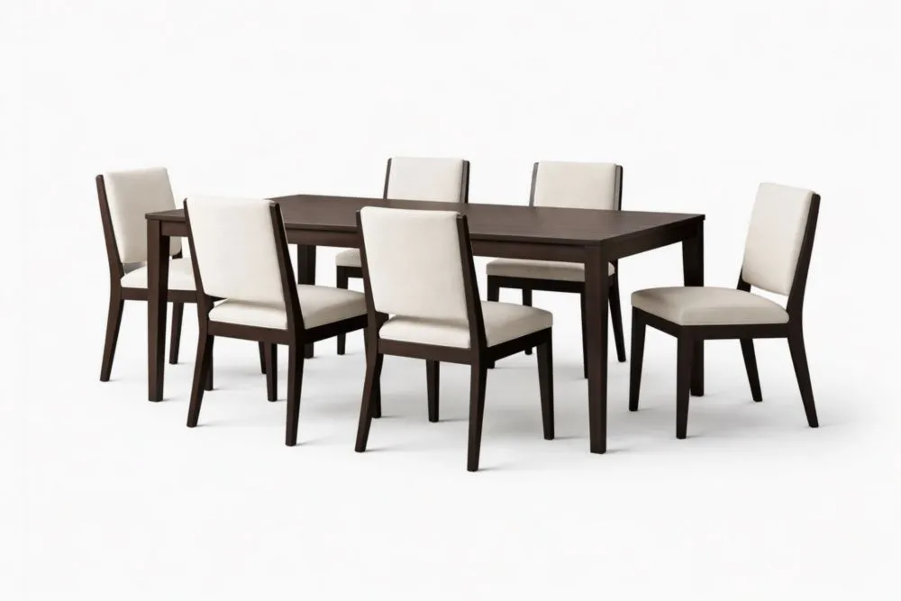 A simple and well-crafted dining set designed for everyday living. Made with walnut-toned timber and cushioned linen seating, it offers a comfortable place for meals, conversations and family time.